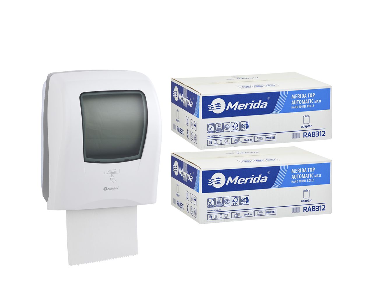 Automatyczny bezdotykowy podajnik ręczników MERIDA ONE biały za 250 zł netto przy zakupie 2 kartonów ręczników MERIDA OPTIMUM AUTOMATIC RAB312 (12 x 250 m = 3 000 m11 760 listków)