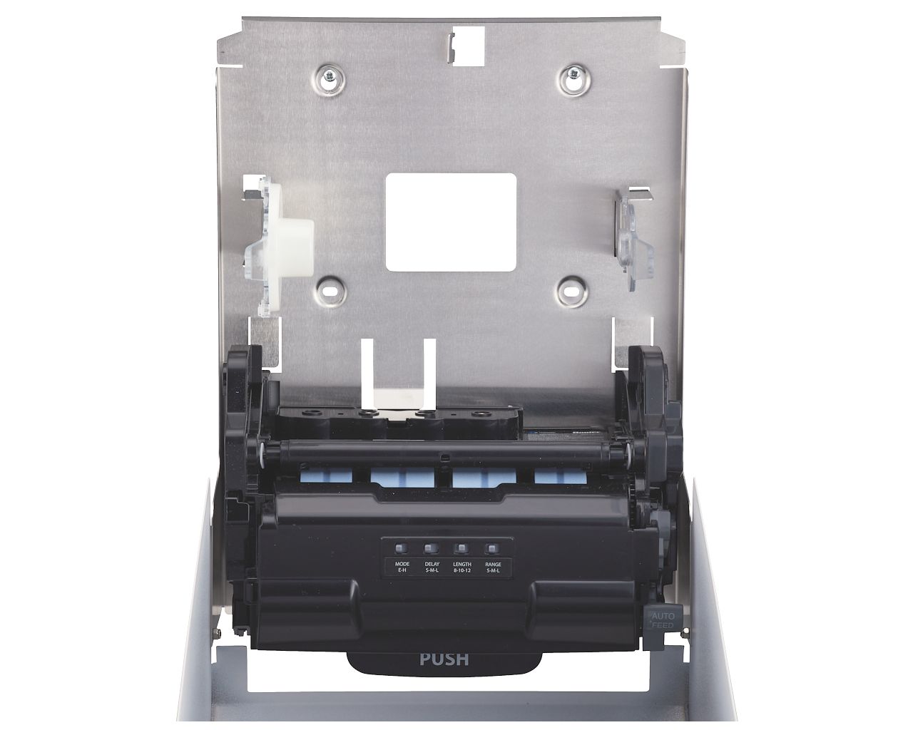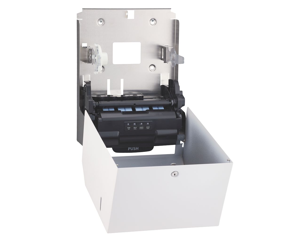Podajnik ręczników zasilany jest 4 bateriami alkalicznym R20 (baterie dołączone) lub zasilaczem sieciowym. Zasilacz chowany wewnątrz urządzenia w miejscu kasety na baterie, zasilacz można podłączyć bezpośrednio do puszki elektrycznej za urządzeniem (zasilacz kupowany osobno). W urządzeniu łatwo zakłada się nową rolkę papieru z wykorzystaniem wewnętrznego przycisku AUTO FEED do automatycznego nawinięcia papieru na rolki. Diodowy wskaźnik stanu urządzenia, umiejscowiony w dolnej części podajnika, migając na niebiesko sygnalizuje gotowość do pracy, migając na czerwono co 5 sekund sygnalizuje słabe baterie, świecąc stale na czerwono sygnalizuje wyczerpane baterie, migając pulsacyjnie na czerwono sygnalizuje zakleszczenie papieru w urządzeniu. W podajniku jest łatwy dostęp do mechanizmu tnącego umożliwiający bezproblemowe czyszczenie oraz konserwację urządzenia. Wykonany ze stali nierdzewnej. Obudowa pokryta specjalną strukturalną białą powłoką. Podajnik ręczników zabezpieczony jest trwałym stalowym zamkiem bębenkowym. Zamek zlicowany z powierzchnią urządzenia. Łączenia boków podajnika ręczników są spawane i szlifowane. Urządzenie posiada niewidoczne zawiasy. Zamykany na kluczyk.