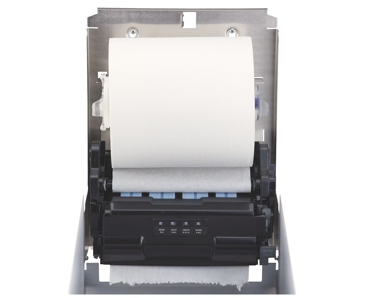 Automatyczny, bezdotykowy podajnik ręczników papierowych w roli zapewnia higieniczne użytkowanie, dotykany jest tylko pobierany ręcznik.