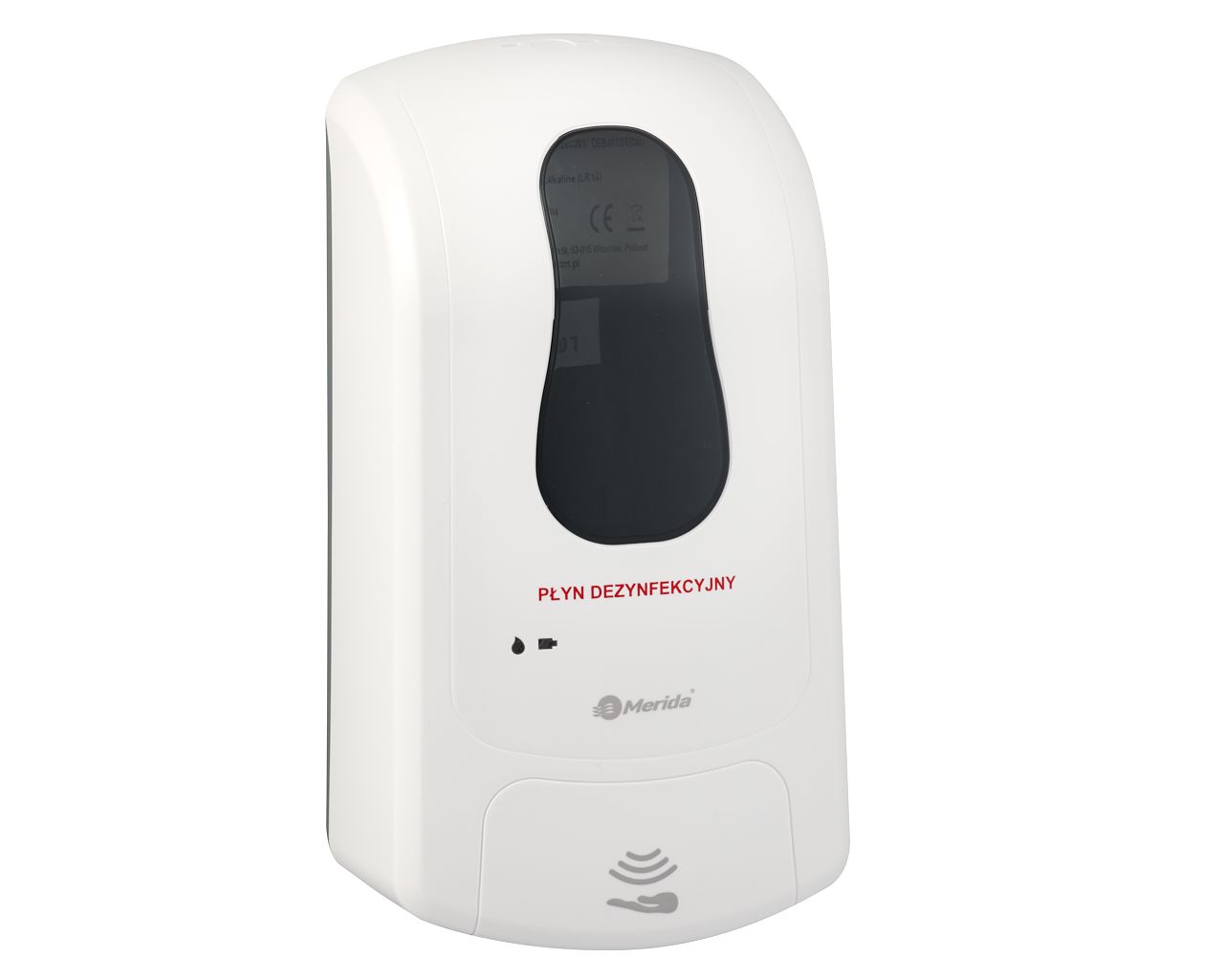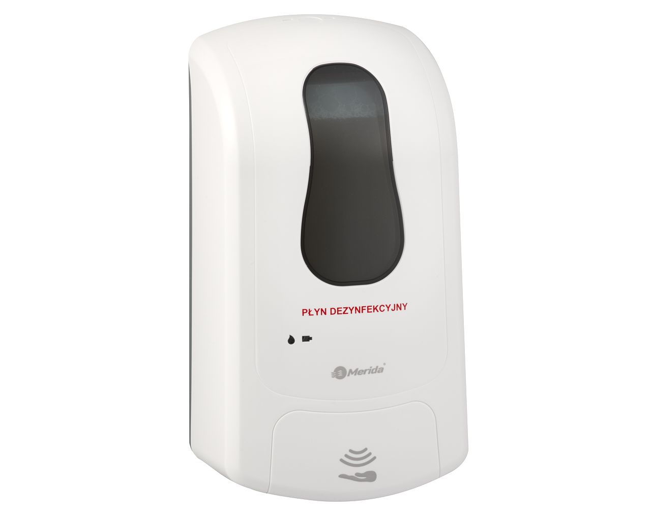 Bezdotykowy automatyczny dozownik płynu dezynfekcyjnego w sprayu MERIDA ONEna jednorazowe wkłady 1000 ml, tworzywo ABSbiały