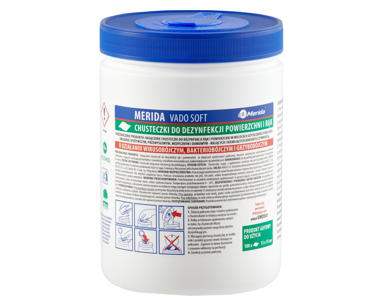 Chusteczki nasączone do dezynfekcji rąk i powierzchni MERIDA VADO SOFTbezalkoholowe, tuba, 15 m100 listków