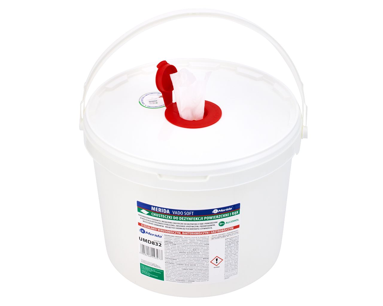 Chusteczki nasączone do dezynfekcji rąk i powierzchni MERIDA VADO SOFTbezalkoholowe, wiadro 10 l, rolka 122,36 m322 listki