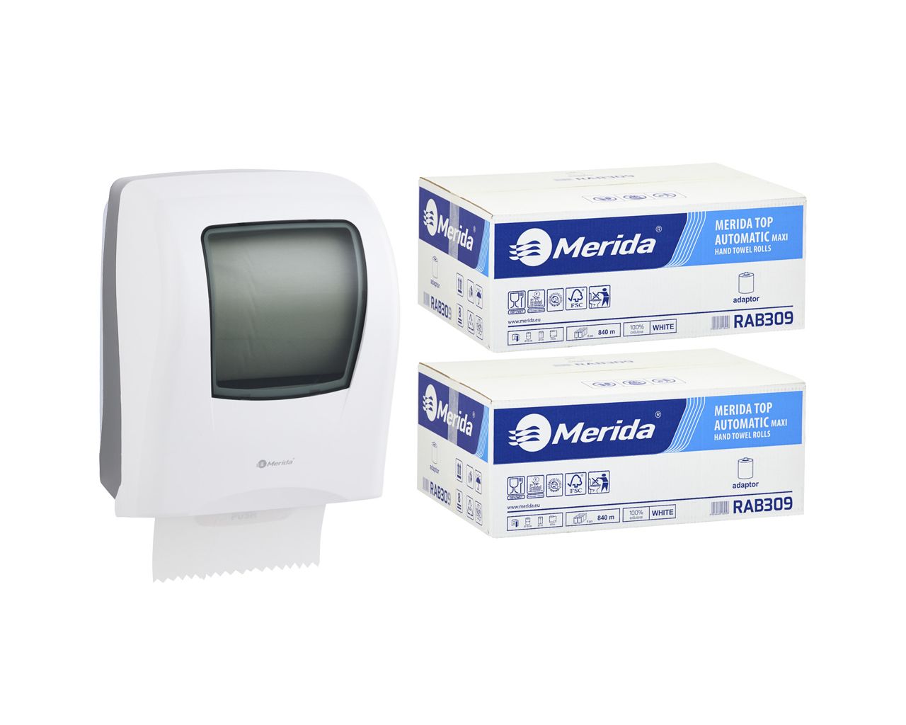 Mechaniczny podajnik ręczników MERIDA ONE biały za 125 zł netto przy zakupie 2 kartonów ręczników MERIDA TOP AUTOMATIC RAB309 (12 x 140 m = 1 680 m6 588 listków)