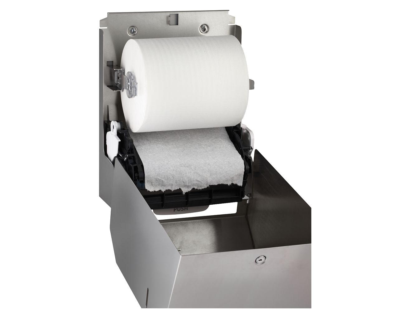 Mechaniczny podajnik ręczników papierowych zapewnia higieniczne użytkowanie, dotykany jest tylko pobierany ręcznik. Pobranie ręcznika uruchamia mechanizm odcinający listek o długości 25,5 cm. Urządzenie charakteryzuje się cichą i delikatną pracą mechanizmu odcinającego. W sytuacji awaryjnej ręcznik można wysunąć przez naciśnięcie dźwigni PUSH, znajdującej się w dolnej części podajnika. Uchwyt rolki wyposażony w system ułatwiający zakładanie ręcznika. Podajnik posiada łatwy dostęp do mechanizmu tnącego umożliwiający bezproblemowe czyszczenie oraz konserwację urządzenia. Podajnik ręczników zabezpieczony jest trwałym stalowym zamkiem bębenkowym. Zamek zlicowany z powierzchnią urządzenia. Łączenia boków podajnika ręczników są spawane i szlifowane. Urządzenie posiada niewidoczne zawiasy, obudowa i tylna ścianka wykonana ze stali nierdzewnej. Zamykany na kluczyk.