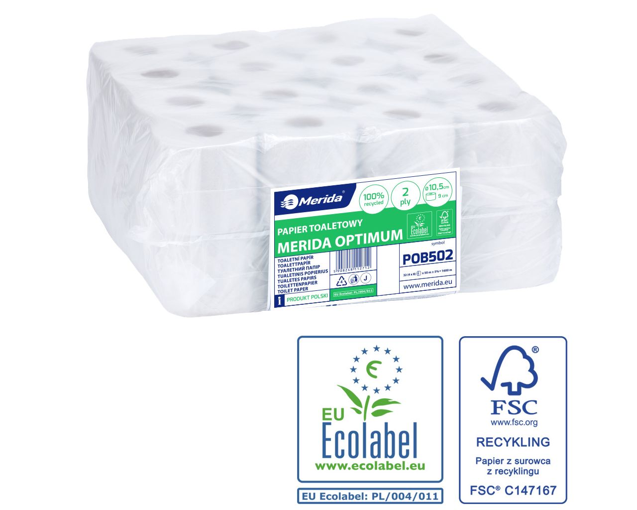 Papier toaletowy MERIDA OPTIMUMbiały, średnica 11 cm, długość 50 m, dwuwarstwowy, worek 32 szt.ECOLABEL