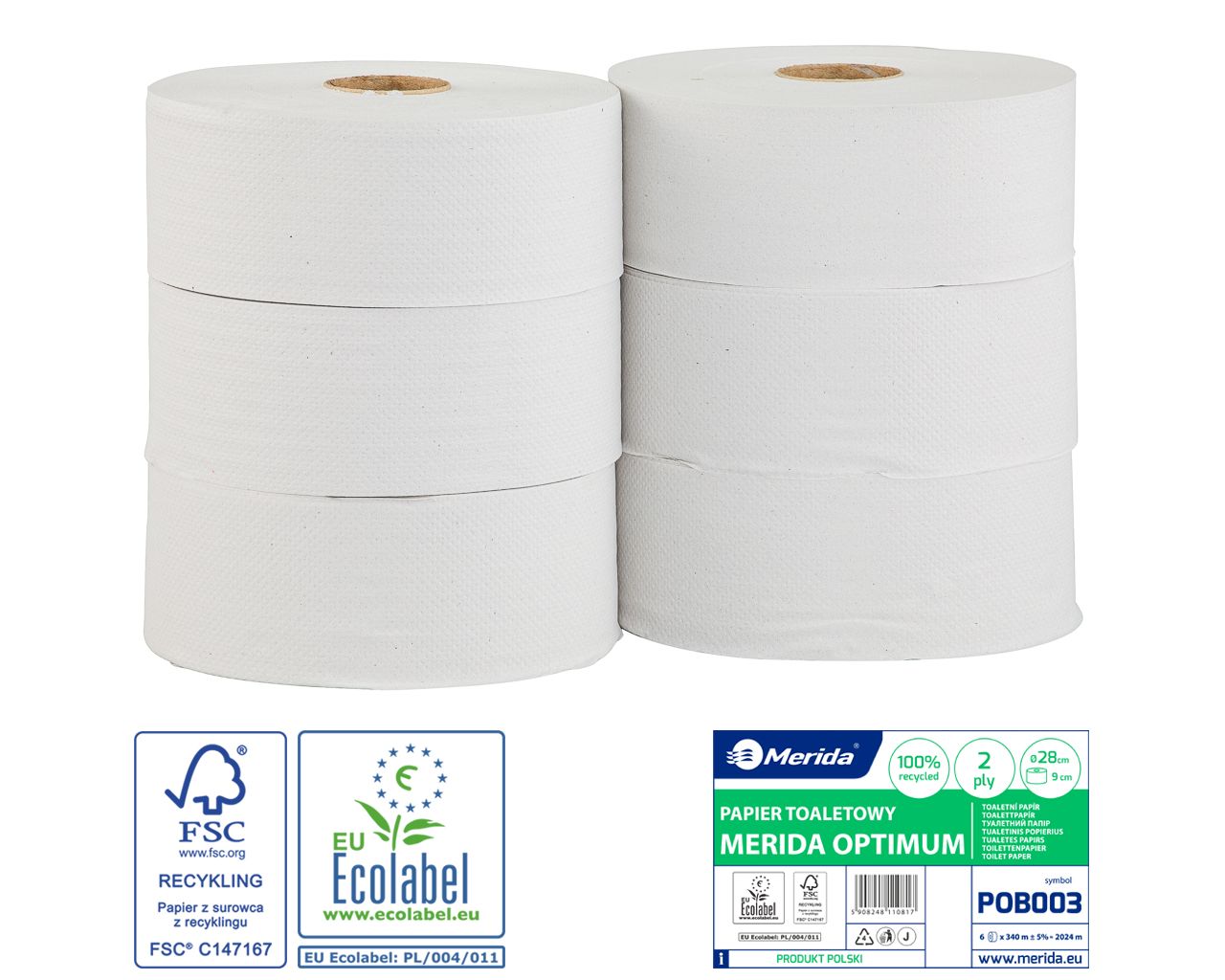 Papier toaletowy MERIDA OPTIMUMbiały, średnica 28 cm, długość 340 m, dwuwarstwowy, zgrzewka 6 szt.ECOLABEL