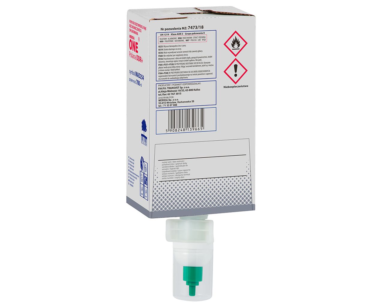 Płyn dezynfekcyjny MERIDA POLANA DDR+ do chirurgicznej i higienicznej dezynfekcji rąkjednorazowy wkład 700 ml z pompką sprayową do dozownika MERIDA ONE