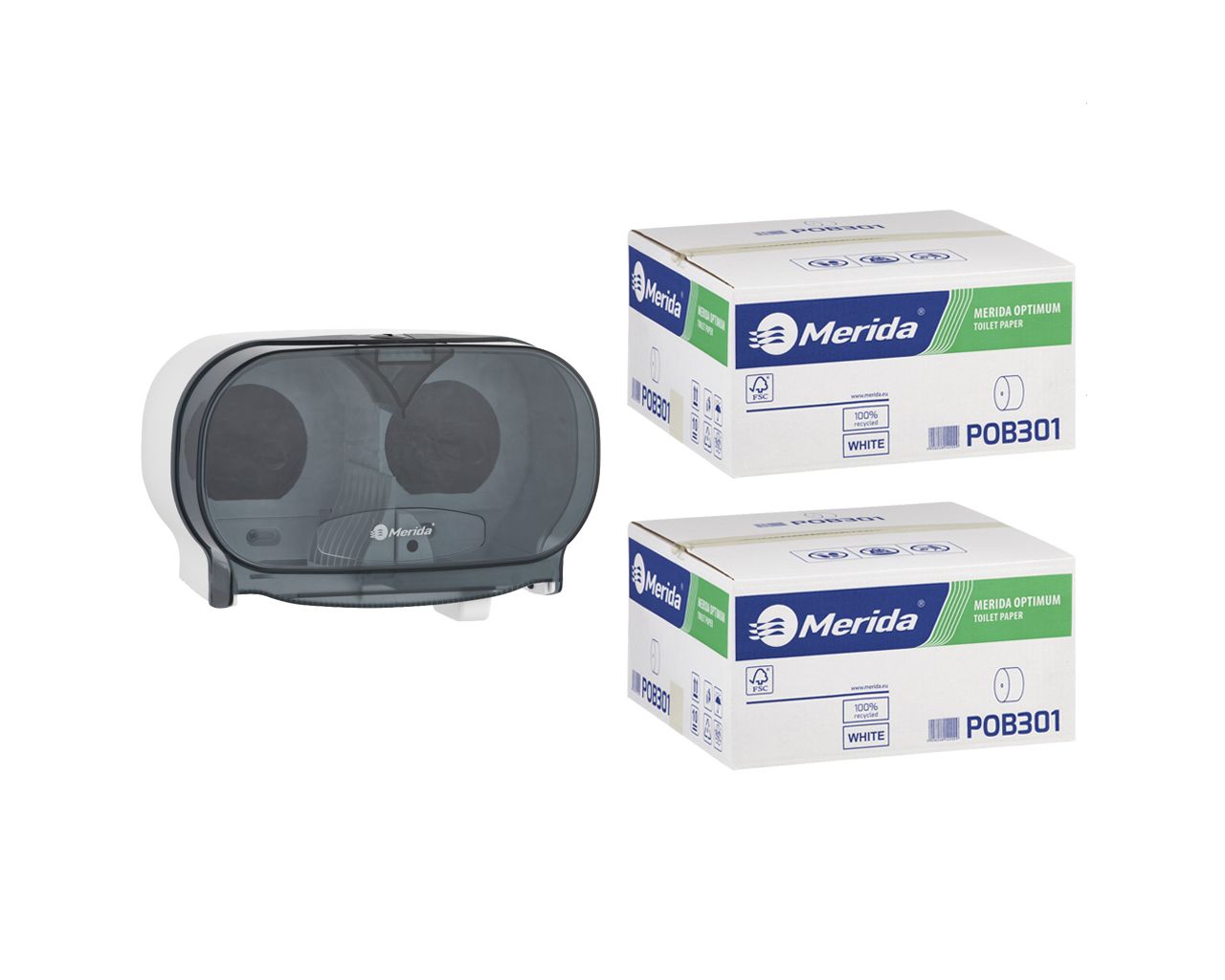 Pojemnik na dwie rolki papieru toaletowego bez gilzy MERIDA ONE biały za 50 zł netto przy zakupie 2 kartonów papiery toaletowego MERIDA OPTIMUM POB301 (36 x 85 m = 3060 m12 240 listków)