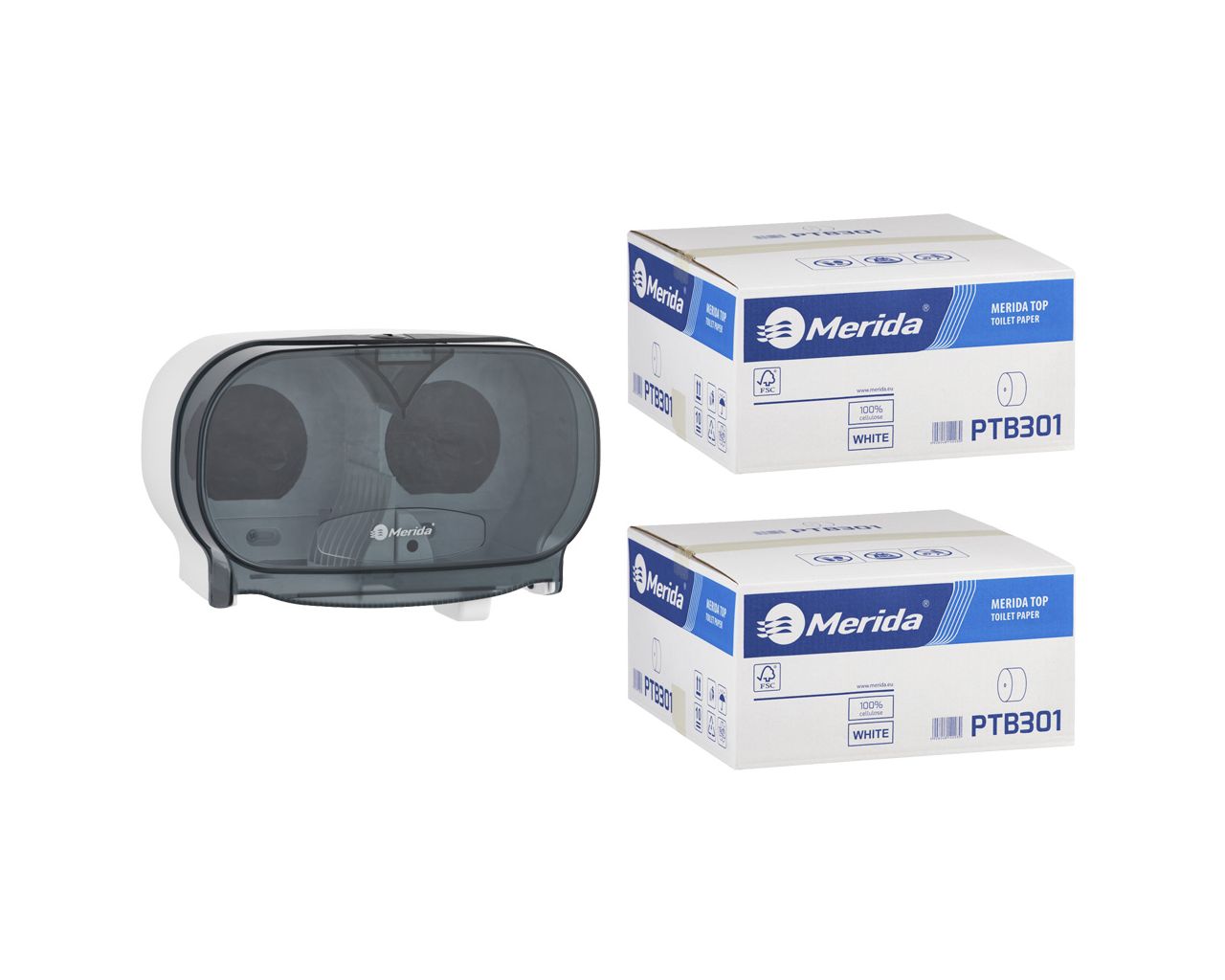 Pojemnik na dwie rolki papieru toaletowego bez gilzy MERIDA ONE biały za 50 zł netto przy zakupie 2 kartonów papiery toaletowego MERIDA TOP PTB301 (36 x 85 m = 3060 m12 240 listków)