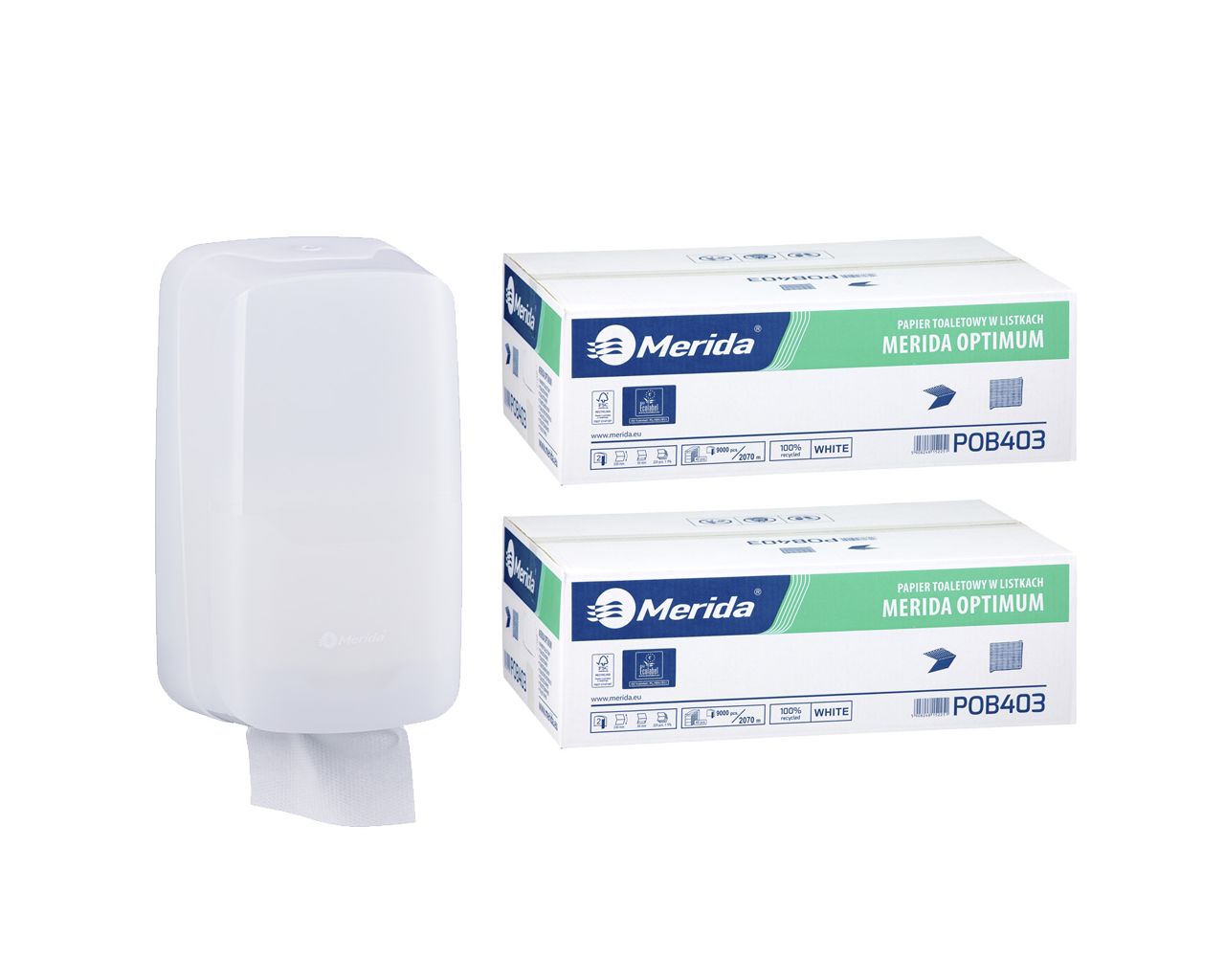 Pojemnik na papier toaletowy w listkach MERIDA HARMONY za 1 zł netto przy zakupie 2 kartonów papierów toaletowych MERIDA OPTIMUM POB403 (18 000 listków)