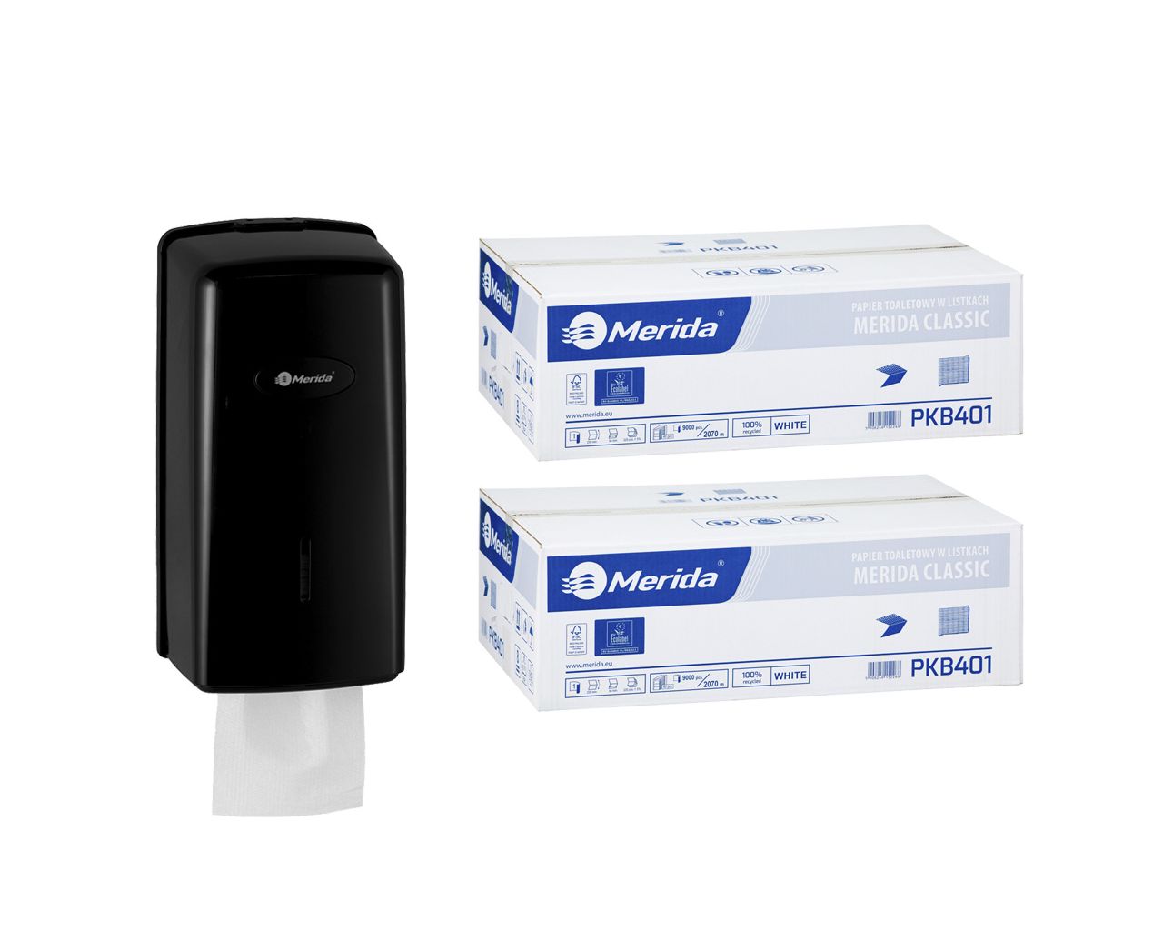 Pojemnik na papier toaletowy w listkach MERIDA ONE za 1 zł netto przy zakupie 2 kartonów papierów toaletowych MERIDA CLASSIC PKB401 (18 000 listków)