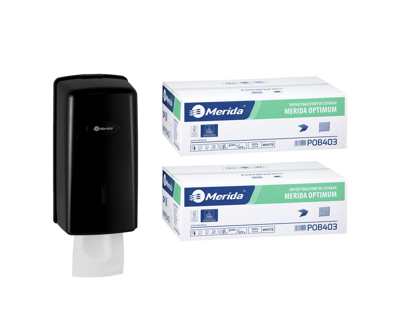 Pojemnik na papier toaletowy w listkach MERIDA ONE za 1 zł netto przy zakupie 2 kartonów papierów toaletowych MERIDA OPTIMUM POB403 (18 000 listków)