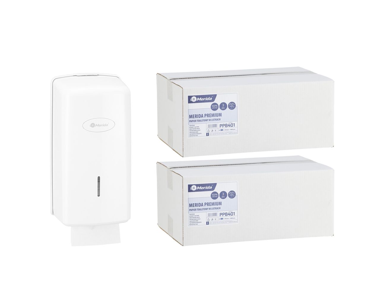 Pojemnik na papier toaletowy w listkach MERIDA ONE za 1 zł netto przy zakupie 2 kartonów papierów toaletowych MERIDA PREMIUM PPB401 (9 600 listków)