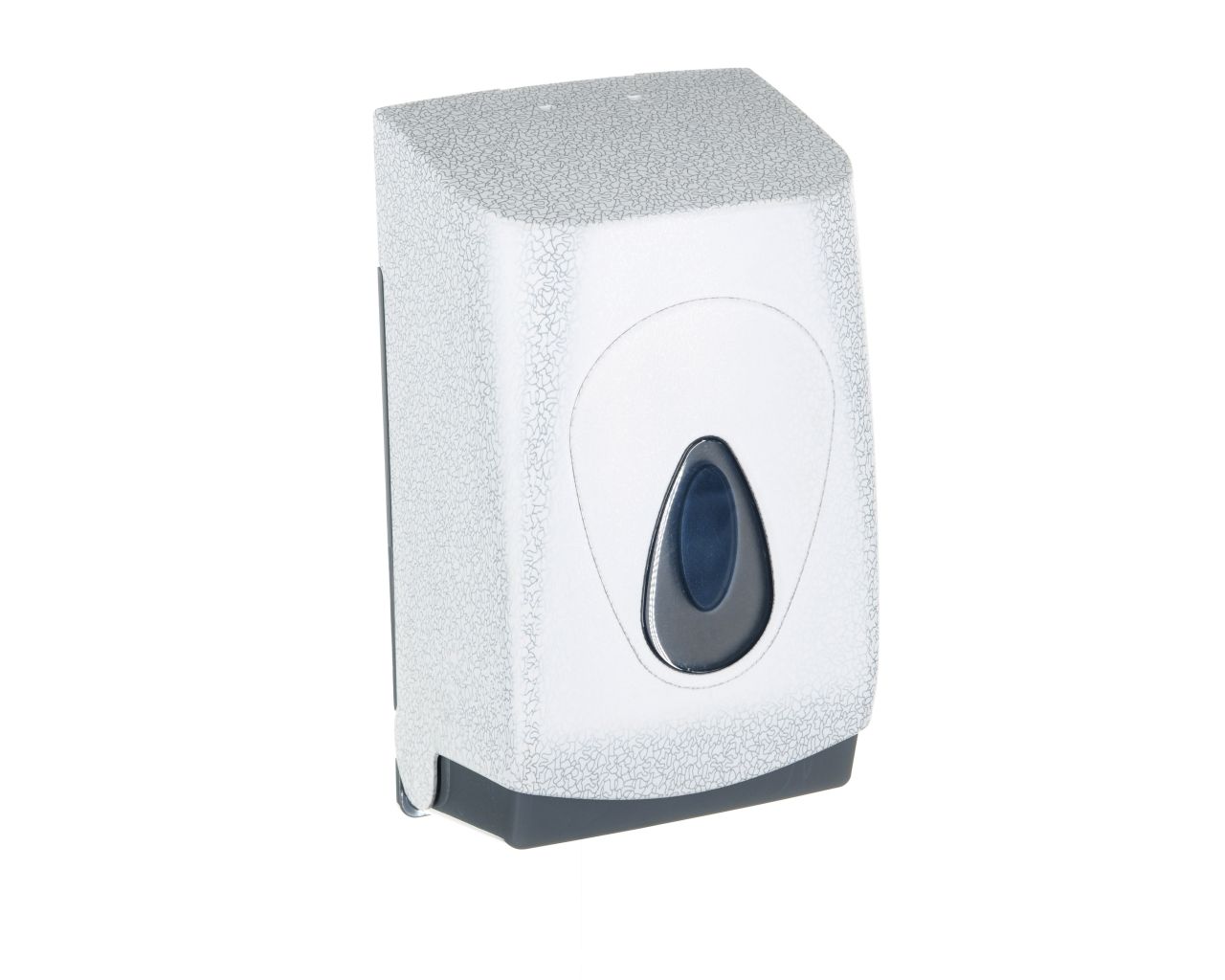 Pojemnik wykonany z wysokiej jakości tworzywa ABS o pojemność do 400 szt. listków papieru. Dostosowany do użytkowania z papierem toaletowym w listkach. Zaopatrzony w ozdobne, ciemnoszare okienko umożliwiające kontrolę ilości papieru w pojemniku. Odporny na działanie UV. Pojemnik zamykany na kluczyk.