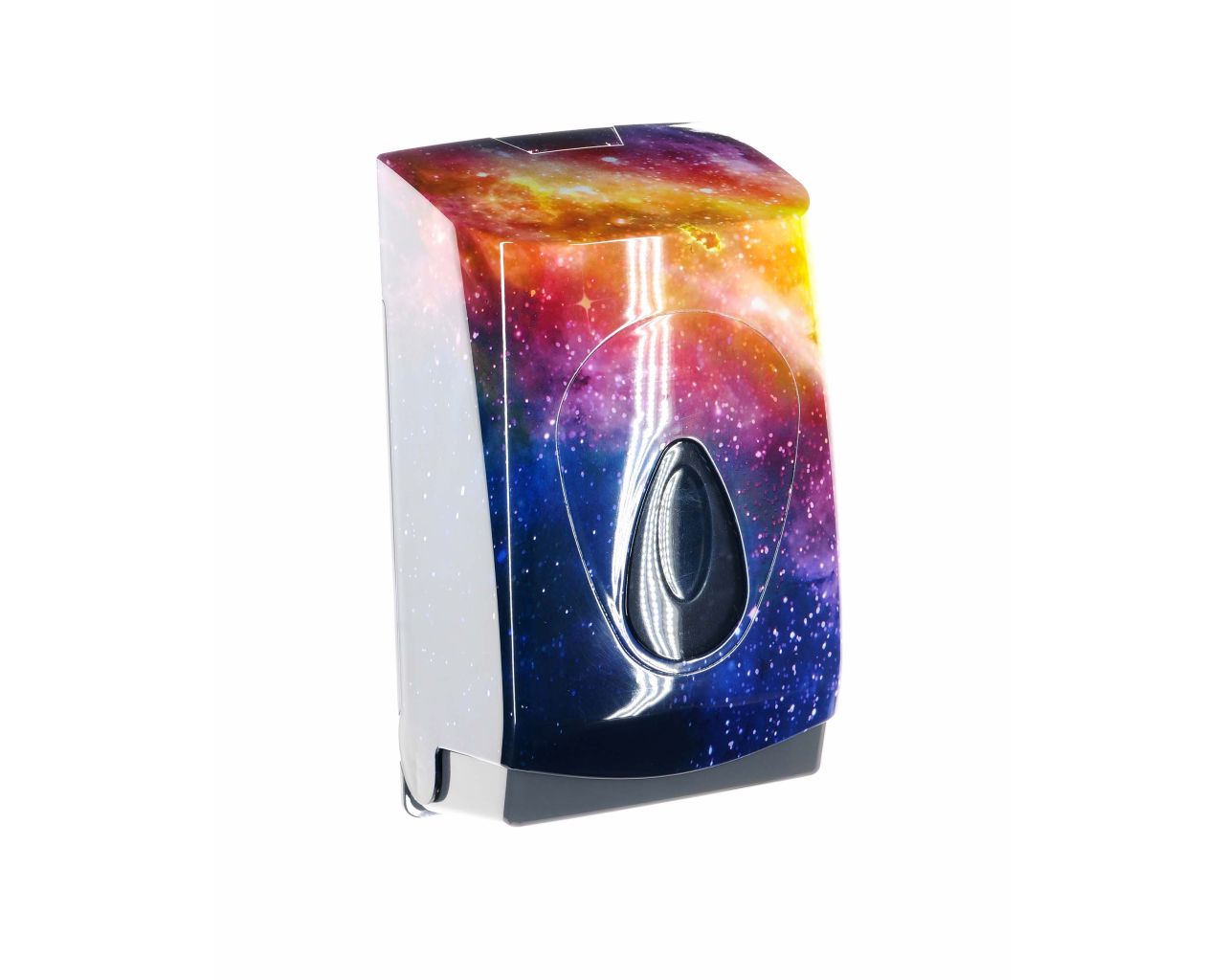 Pojemnik wykonany z wysokiej jakości tworzywa ABS o pojemność do 400 szt. listków papieru. Dostosowany do użytkowania z papierem toaletowym w listkach. Zaopatrzony w ozdobne, ciemnoszare okienko umożliwiające kontrolę ilości papieru w pojemniku. Odporny na działanie UV. Pojemnik zamykany na kluczyk.