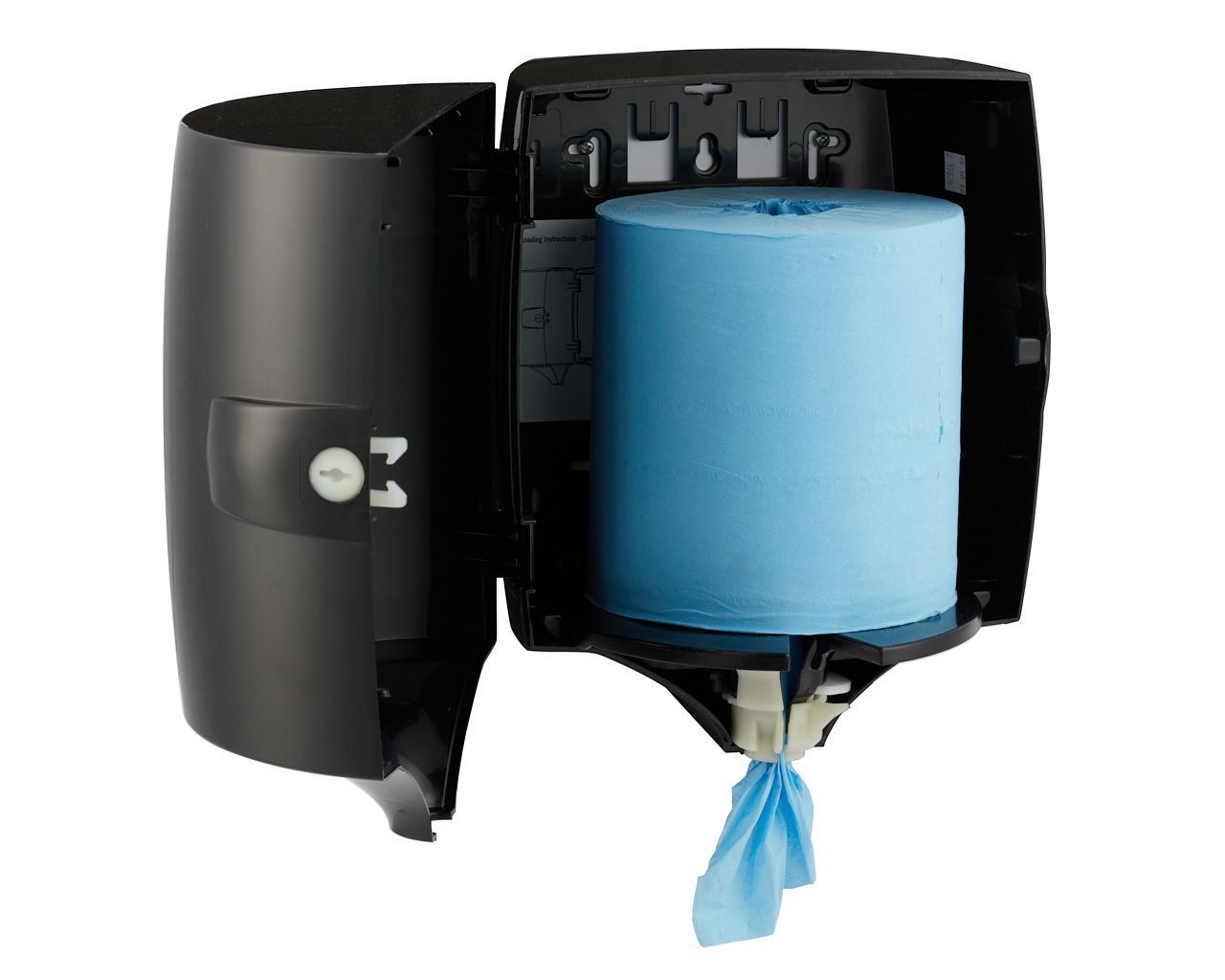 W urządzeniu można stosować ręczniki perforowane jedno lub dwuwarstwowe. Boczne otwieranie pojemnika ułatwia wymianę rolki ręcznika oraz umożliwia montaż bezpośrednio pod szafką wiszącą bez konieczności pozostawienia miejsca nad pojemnikiem (co konieczne jest w pojemnikach otwieranych od góry). Boczne otwieranie umożliwia zamontowanie pojemnika „do góry nogami” (montaż pojemnika pod lub na blacie). Zamykany na kluczyk.