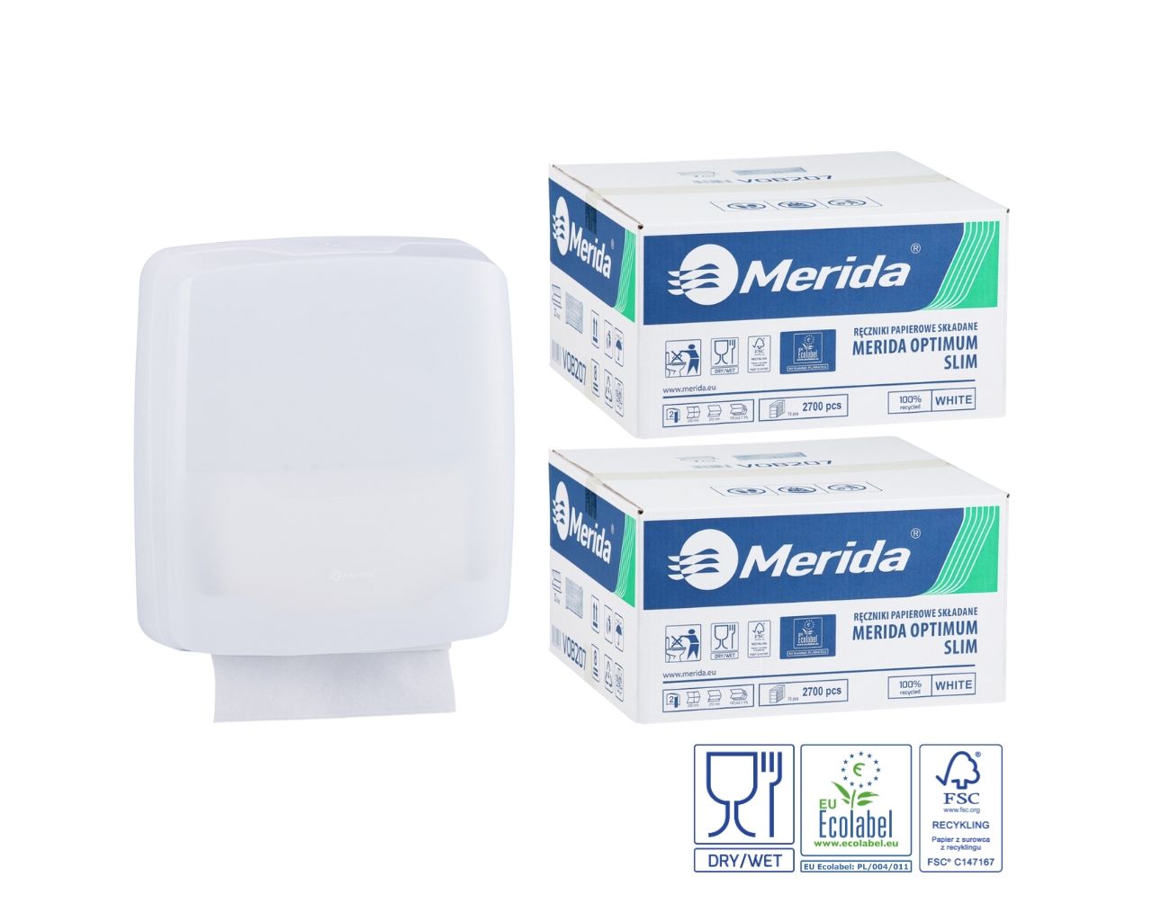 Zestaw promocyjny: biały pojemnik Merida Harmony SLIM + 2 kartony ręczników Classic SLIM Ecolabel