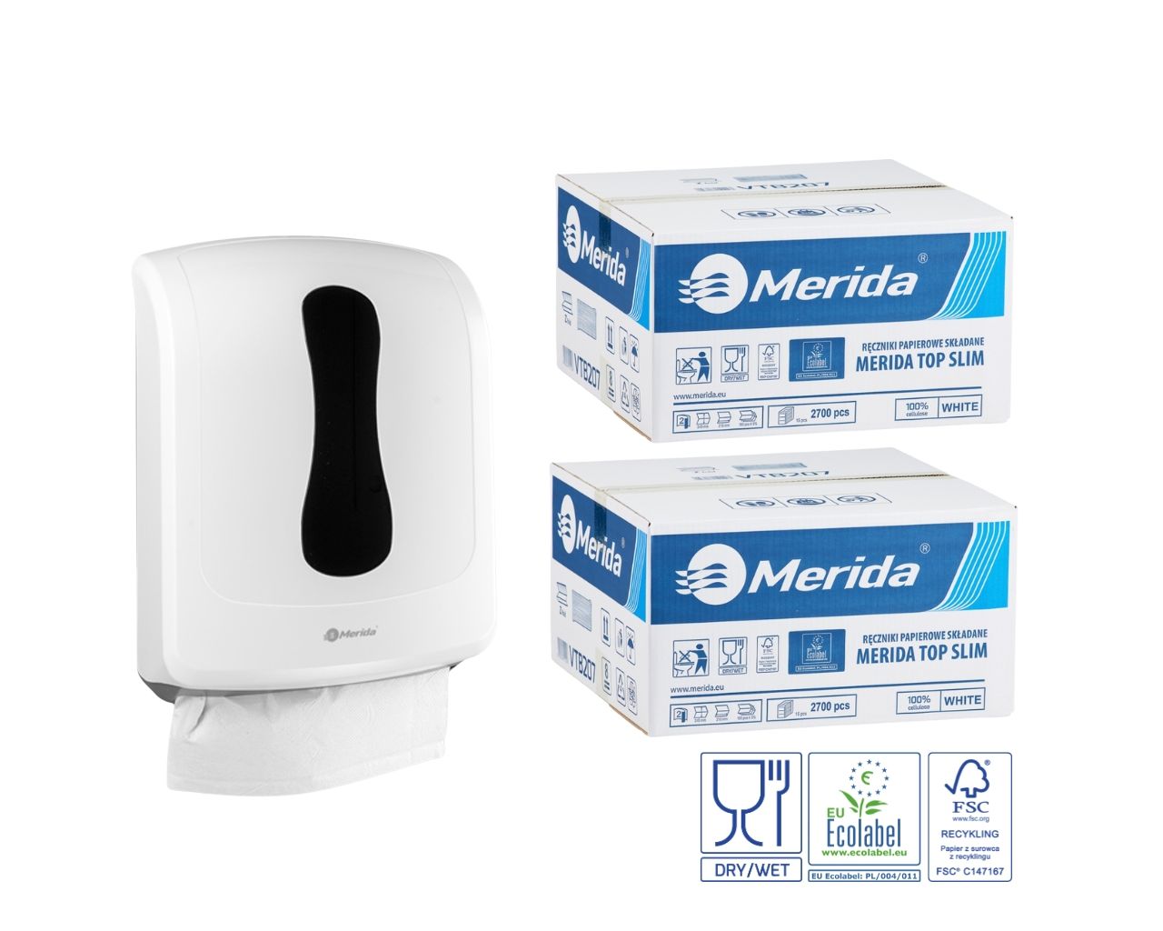 Zestaw promocyjny: Merida ONE SLIM biały + 2 kartony ręczników TOP SLIM Ecolabel