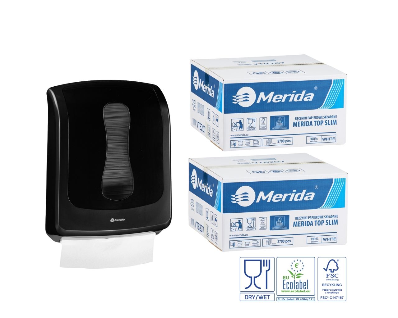 Zestaw promocyjny: czarny pojemnik Merida ONE SLIM + 2 kartony ręczników Top SLIM Ecolabel
