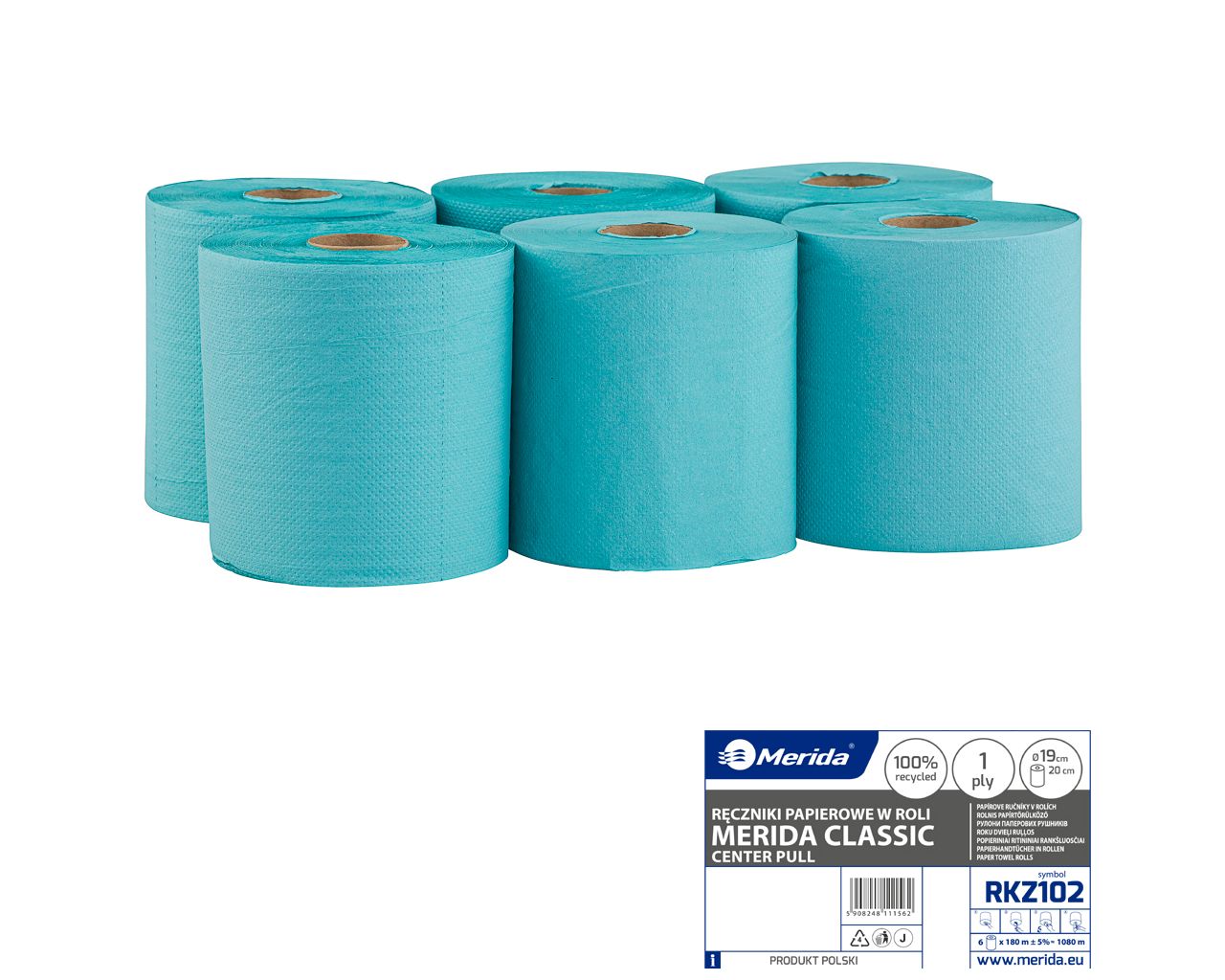 Ręczniki papierowe w roliMERIDA CLASSIC CENTER PULL MAXI, jednowarstwowe, zielone, średnica 19 cm, długość 180 mzgrzewka 6 rolek