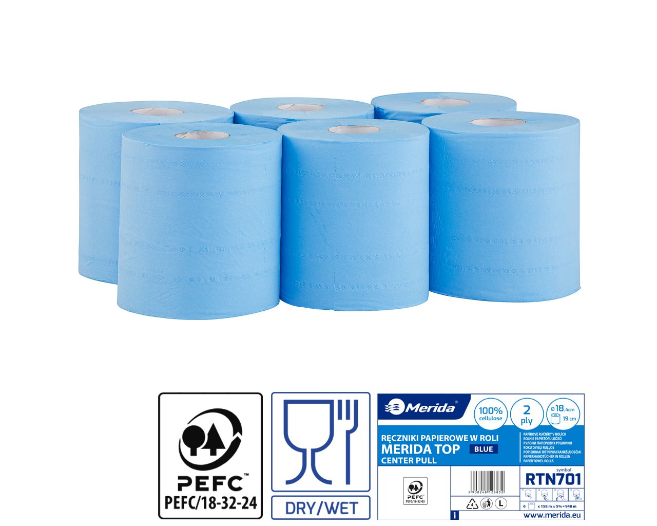 Ręczniki papierowe w roliMERIDA TOP CENTER PULL MAXI, dwuwarstwowe, niebieskie, średnica 18,4 cm , długość 160,1 mzgrzewka 6 rolek