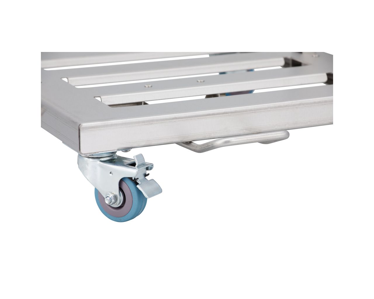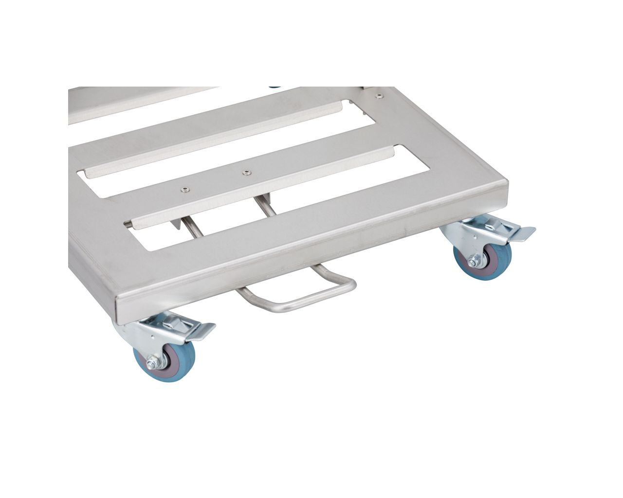 – wyposażony w 4 kółka łożyskowe o średnicy 50 mm w tym 2 z hamulcem w dwóch osiach, opony gumowe niebrudzące posadzki