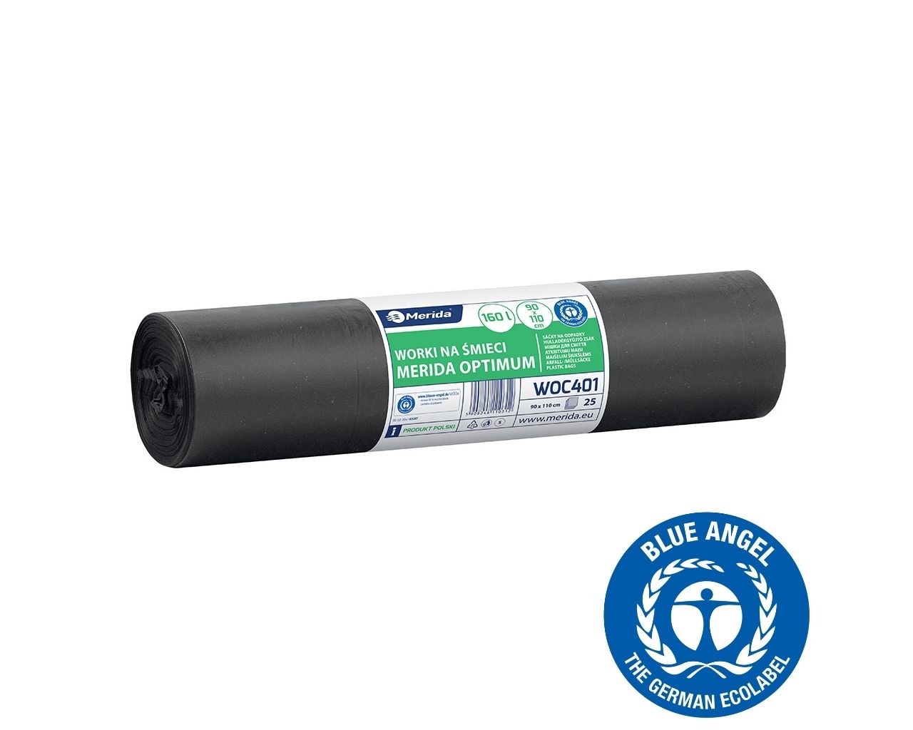 Worki na śmieci 160 lMERIDA OPTIMUM BLUE ANGEL, czarne, 90×110 cmrolka 25 szt.