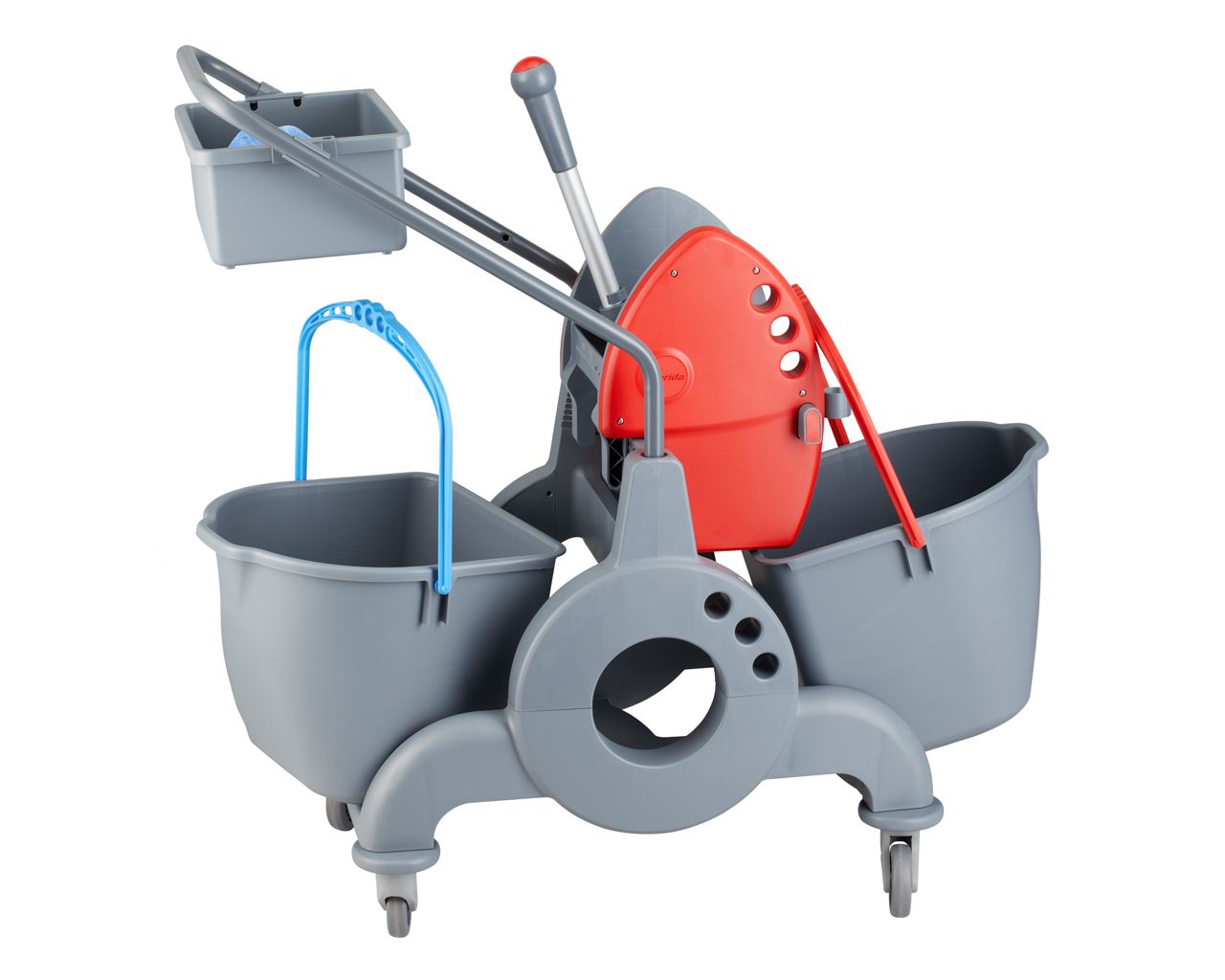 Wózek serwisowy do sprzątaniadwuwiadrowy, 2× wiadro 15 l, kuweta 8 lczerwona prasa